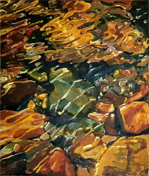 These paintings in oil capture the essence of 'Details of a River', showcasing the medium's patient and elegant nature. Each stroke of color, every shape, texture, movement, and the interplay of layers and transparencies intertwine harmoniously. In this artistic realm, the mortality of fleeting moments is forgotten, as the river etches an indelible mark on our collective memory.